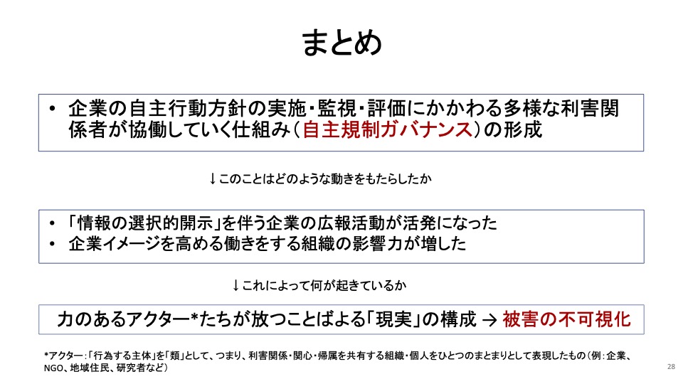 ひとつは、被害を掘り起こしていくことです。地域のいろんな問題というのは、自主規制ガバナンスが動き出すことによってさらに見えにくいものになってきています。ですので、現場の声を拾い上げて、被害の実態を描いていくということです。これは、環境社会学者をはじめとして、こうした問題にかかわる研究者、NGO、ジャーナリスト、市民調査を行う市民に必要なことの一つだと思います。