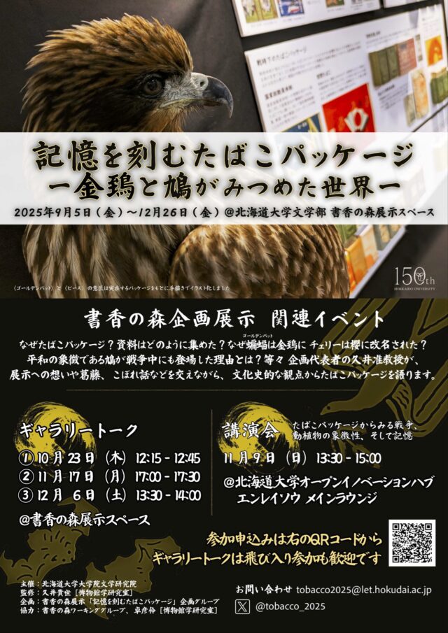 書香の森の企画展示を更新しました。この展示は、久井貴世准教授(博物館学研究室)のコレクションを主な素材として、歴史・文化的な観点からたばこパッケージを紹介するもので、多様な側面をもつたばこという存在を文化史的に捉えなおし、たばこパッケージをとおして戦争、意匠としての動植物の象徴性、記憶について考えることを目的としています。久井准教授と博物館学研究室の学生が企画・制作しました。