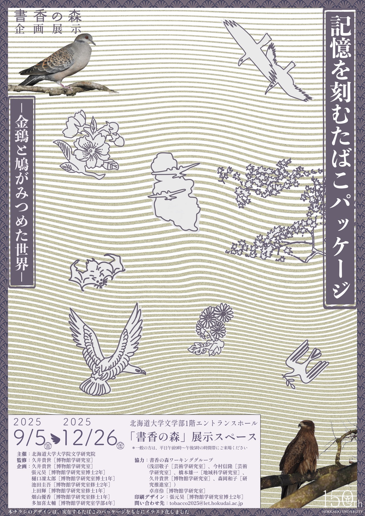 本展示では、たばこをめぐる世界をみつめてきた「金鵄(きんし)」と「鳩」をシンボルとして、その目を借りながら、たばこパッケージに刻まれた時代と社会と人々の記憶を振り返っていく。そこには、戦後80年を迎えた本年に改めて考えるべき戦争とのつながりもみえてくる。たばこを吸う人も吸わない人も、好きな人も嫌いな人も、まずはまっさらな気持ちで、いつもとは違ったまなざしでたばこをみつめていただければ幸いである。