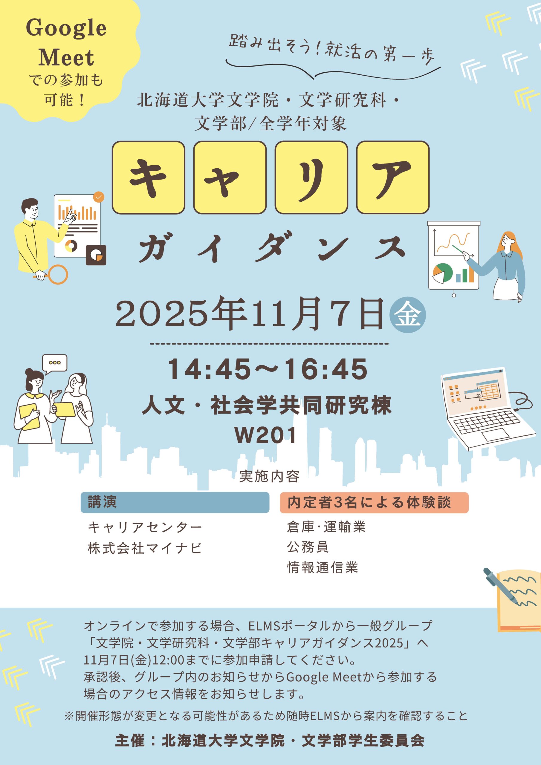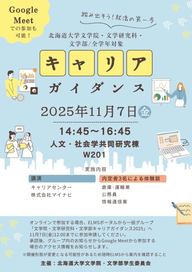 オンラインで参加する場合、ELMSポータルから一般グループ「文学院・文学部キャリアガイダンス2025」へ11月7日(金)12:00までに参加申請してください。