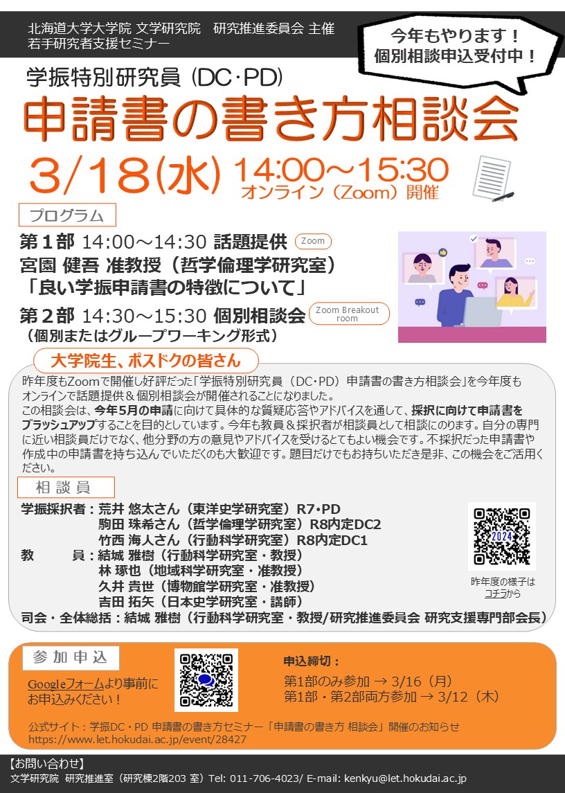※個別相談会は、原則今年5月にDCまたはPDに申請する文学院生および文学研究院ポスドクのみ対象です。