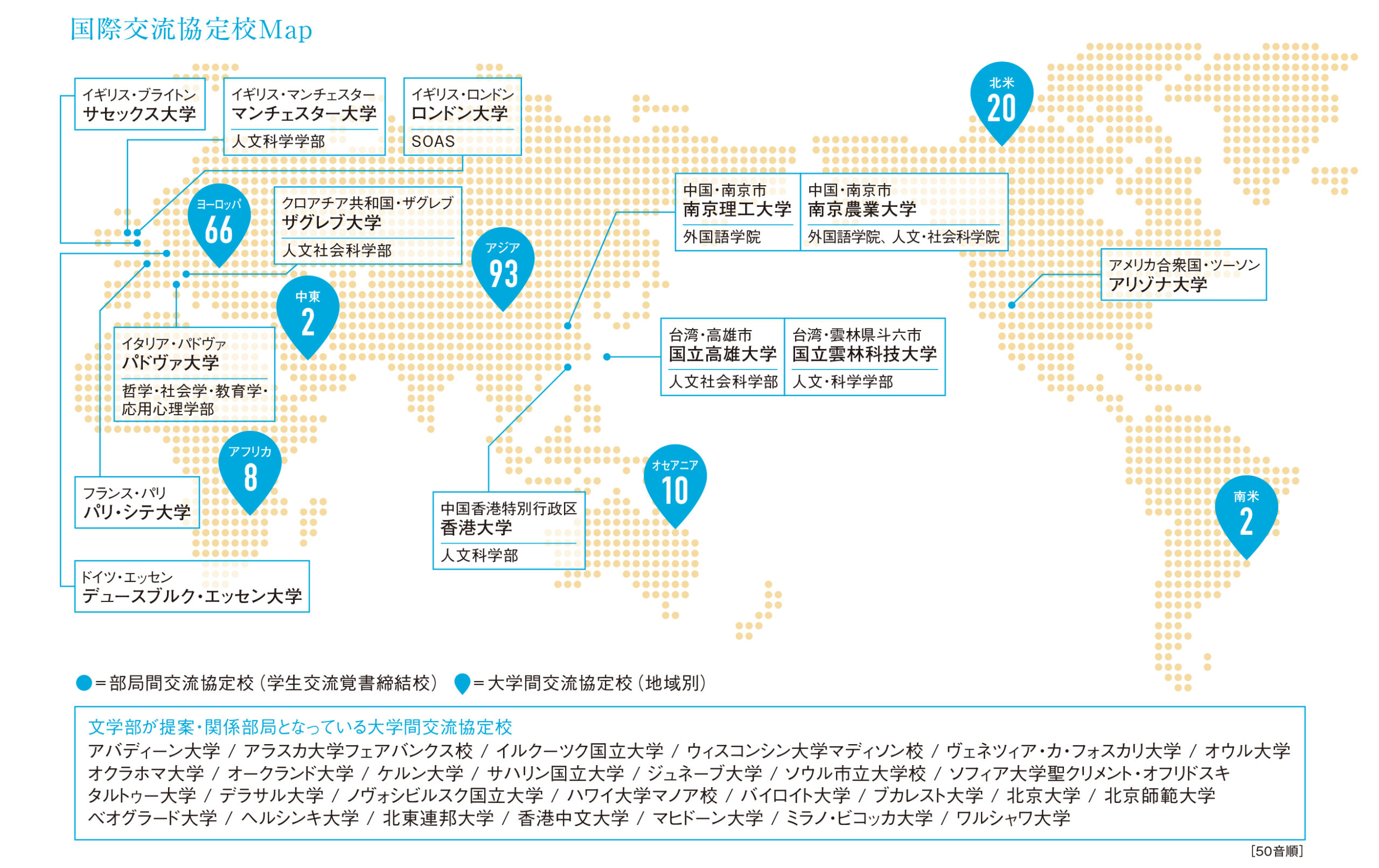 文学部・文学院からは、以下のような部局間および大学間協定校に、交換留学しています(令和元年度〜令和5年度出発)。交換留学の留学期間は、一般的には1学期間(1セメスター)または1年間です。なかには協定校のサマープログラムなどに参加する短期留学をする場合もあります(以下のリスト中の※は、短期プログラム、オンライン留学を含む)。また、協定校以外の海外大学に留学する学生もいます。