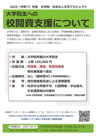 文学院では「共生の人文学」プロジェクト(Graduate Grant Program)として、校閲費支援を行っています。