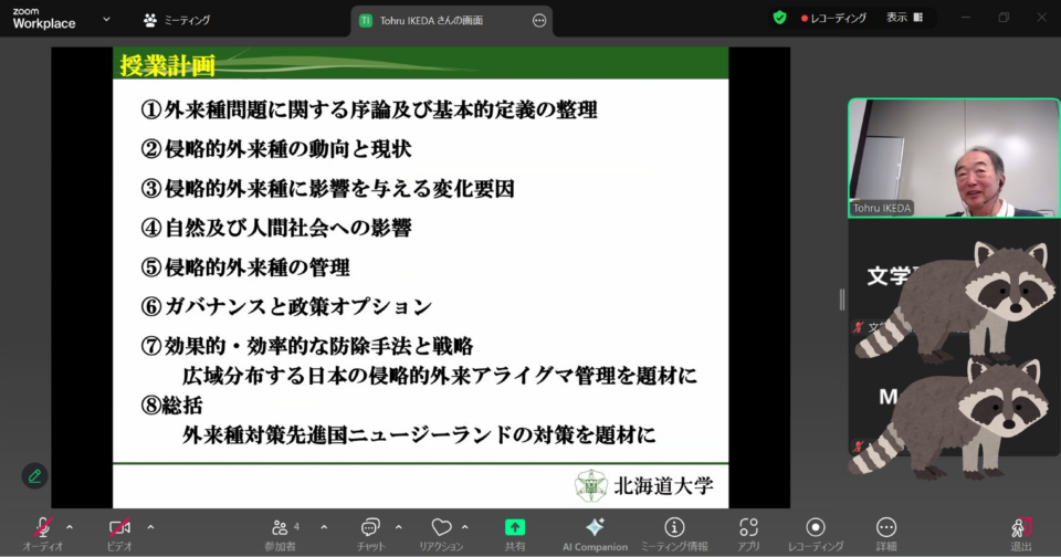 8月4日~5日の2日間、Hokkaido Summer Institute 2025 / Hokkaidoサマー・インスティテュート2025開講リカレント科目「侵略的外来種防除専門家養成講座 2025」(Training course for specialists in invasive alien species management 2025)がハイブリッド形式で開講されました。実践的専門家を養成することを目的に、日本語で実施する社会人向けリカレント科目のHSI2024に続く2回目の開講です。HSI2024では3日間15コマの集中講義として開講した本科目ですが、HSI2025では社会人受講生がより参加しやすいようにコンパクトにまとめ、2日間8コマの集中講義として開講しました。