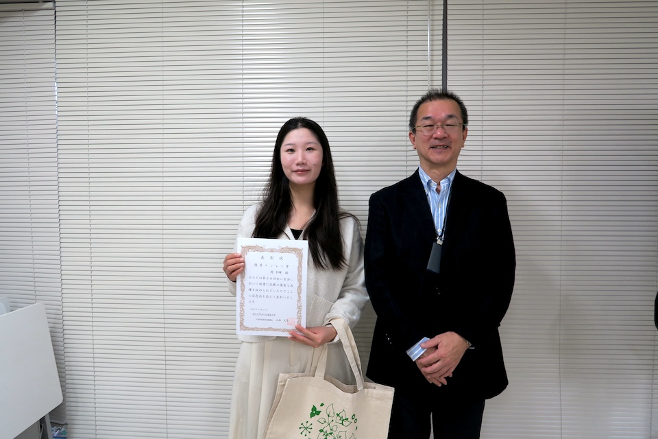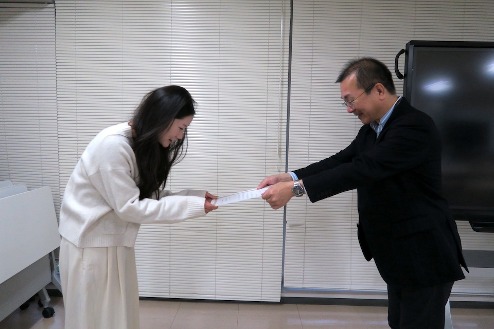 博士後期課程の周宇暉さんが「第60回赤い糸会」の優秀エンレイ賞を受賞 掲載日: 2025年12月12日 受賞 文学院博士後期課程2年の周宇暉さん(心理学研究室)が、本学先端人材育成センター主催の第60回 赤い糸会において優秀エンレイ賞を受賞しました。 赤い糸会は,博士・ポスドク研究員と企業を結びつけ、キャリアの可能性を広げる交流イベントです。今回はオンラインで実施され、博士人材のプレゼンに対して参加企業が投票した結果をもとに、最優秀エンレイ賞1名、優秀エンレイ賞4名が選ばれました。 吉原 拓也 先端人材育成センター センター長との記念写真 本件に関するお問い合わせ 金子 沙永(心理学研究室 准教授) sakaneko@let.hokudai.ac.jp