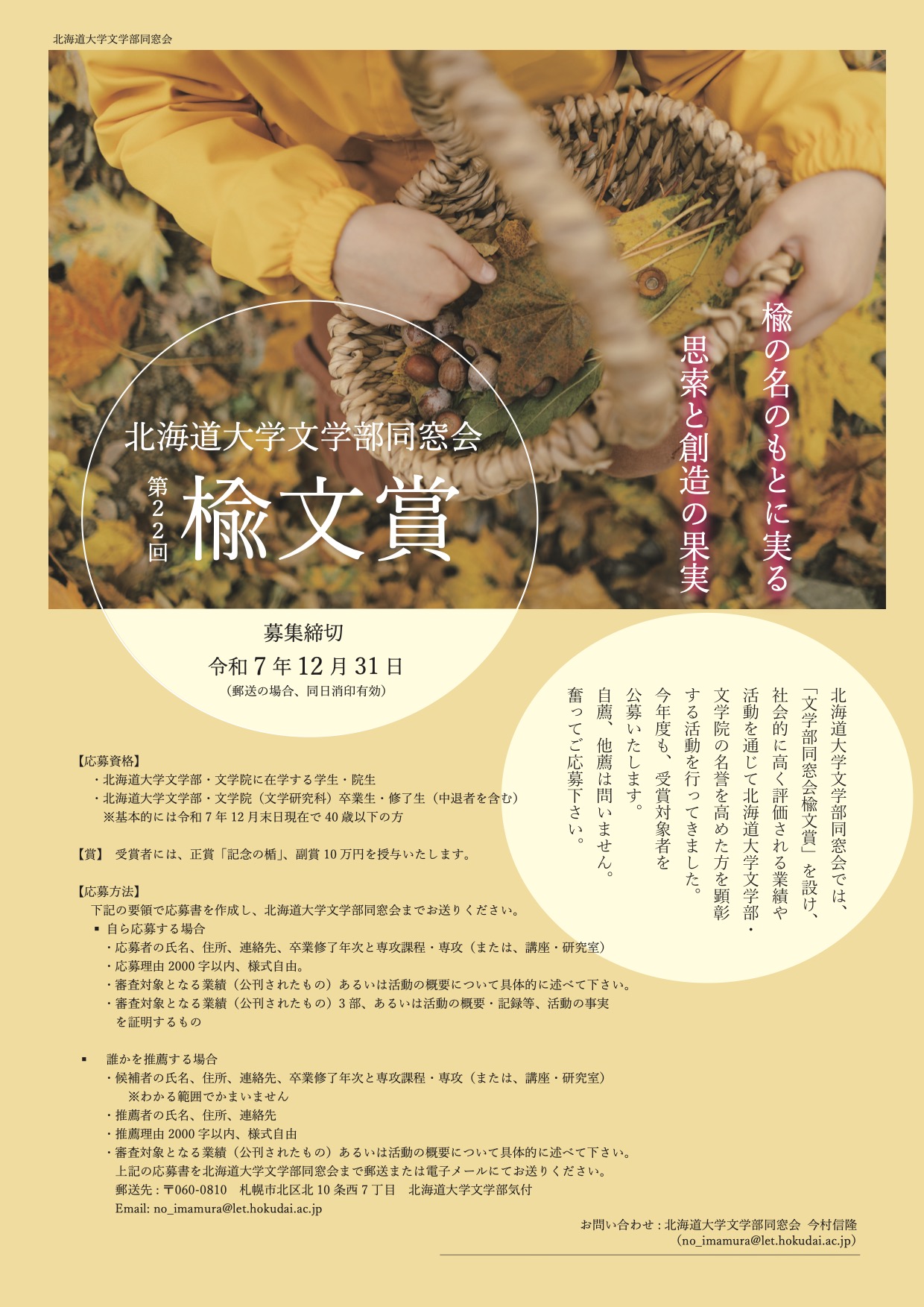 北海道大学「文学部同窓会第22回楡文賞」公募のご案内