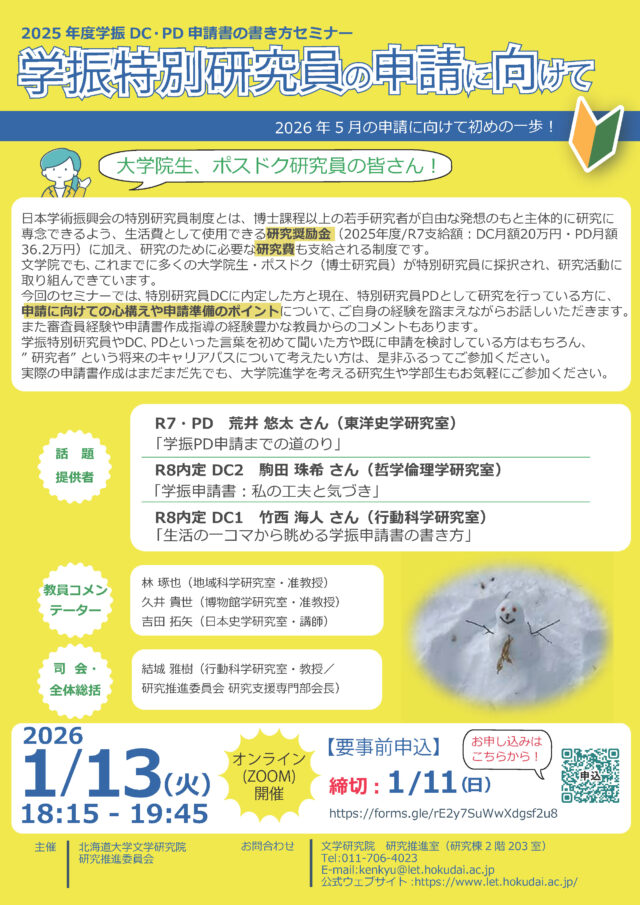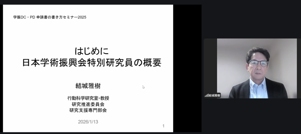 1月13日(火)に、文学研究院研究推進委員会主催の若手研究者支援セミナー「学術振興会特別研究員DC・PD申請書の書き方セミナー2025~学振特別研究員の申請に向けて―はじめの一歩!~」をZoom開催しました。本セミナーの対象者は、今年5月に学振特別研究員DCやPDに申請する大学院生およびポスドクのほか、学部生や修士課程1年生で今回初めて学振特別研究員制度について耳にする学生さんです。
