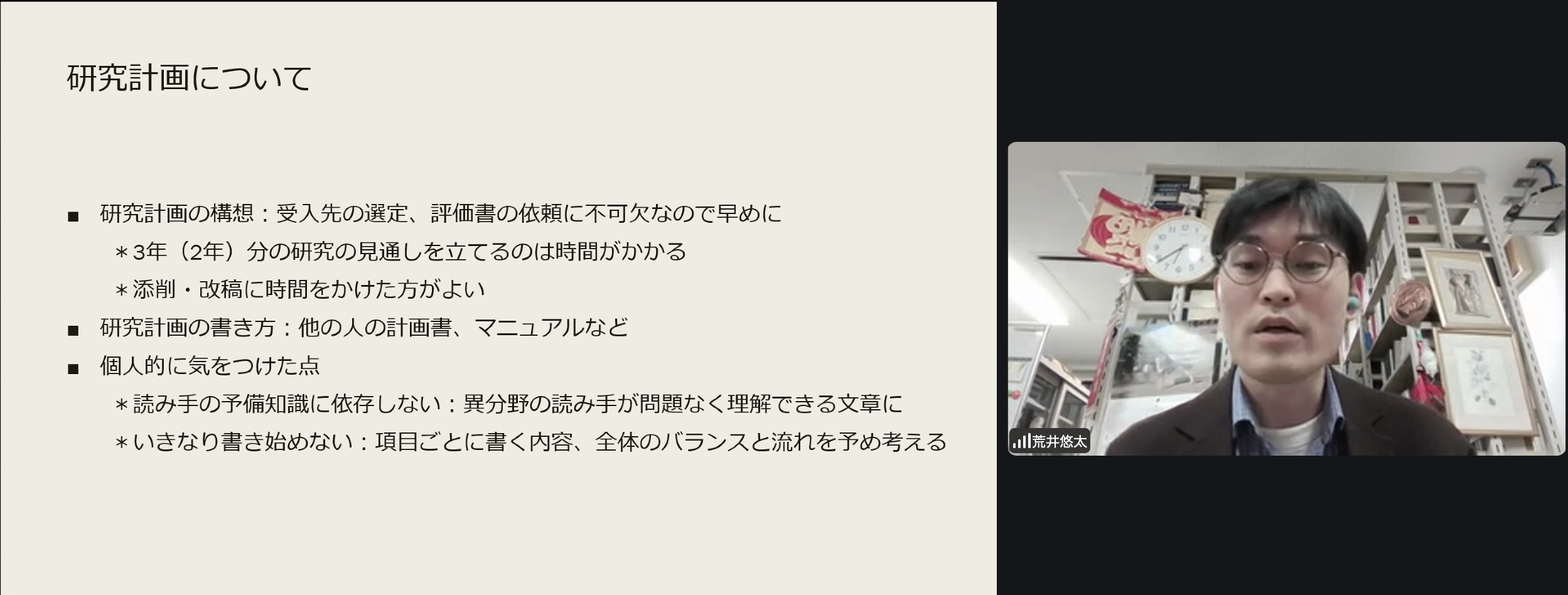 話題提供の一人目は、令和7年度採用PDの荒井 悠太さん(東洋史学研究室)です。『学振PD申請までの道のり』と題し、早稲田大学から本学への機関移動を伴うPDの申請経験をお話しいただきました。PDに申請することを決めてから実際に申請するまでの流れを解説するとともに、申請書を作成する際の留意点について具体的なアドバイスをいただきました。PDは、大学院生として所属した大学とは異なる大学に機関移動することが決められており、受け入れる研究者が所属する機関を通して申請手続きを行う必要があります。そのため、実際の申請時期は例年5月ですが、なるべく早めに受入研究者とコンタクトを取り、意思疎通をしておいたほうがよい、ということです。また、申請書の作成については、添削・改稿に時間をかけること、既に申請に関するマニュアル本があるのでそこで提示されているレベルが前提水準であること、読み手の予備知識に依存せず異分野の人が理解できる文章にすること、などが挙げられました。申請手続きも、申請書作成も、とにかく準備を早めに始めて「採択された人の申請書をたくさん読むこと、他の人にたくさん読んでもらうこと」が推奨される、ということです。