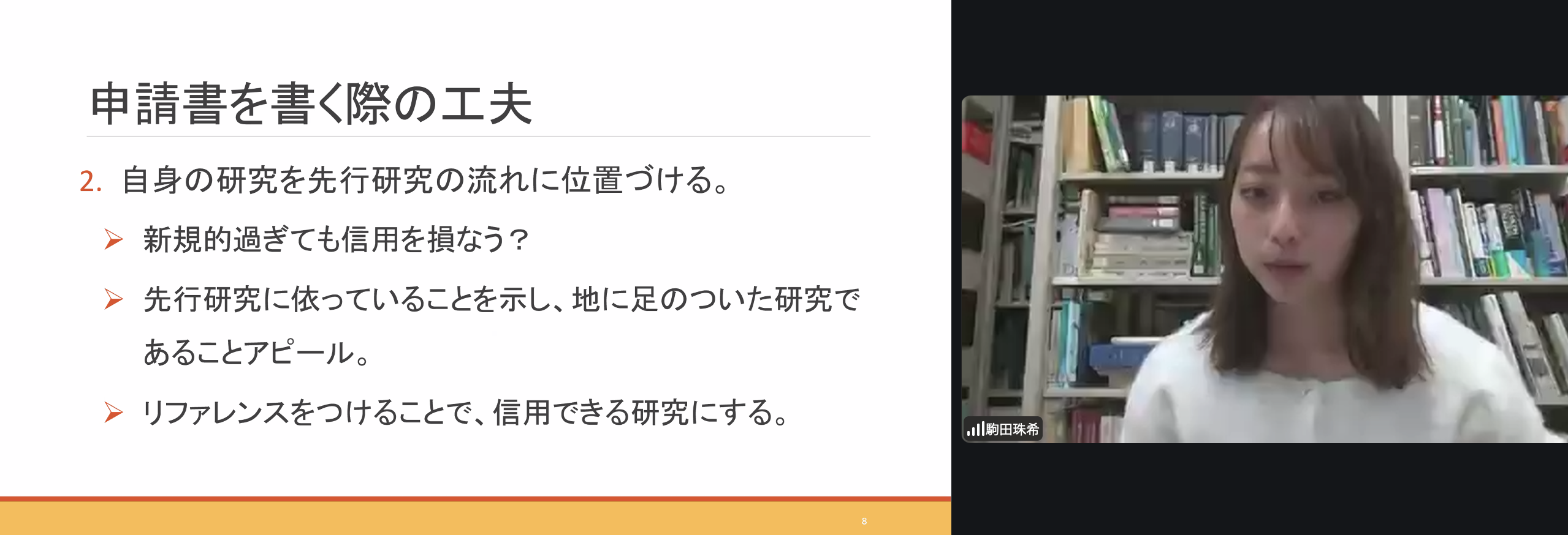 二人目は、来年度(令和8年度)DC2に採用内定した駒田 珠希さん(哲学倫理学研究室)に、『学振申請書:私の工夫と気づき』について話題提供いただきました。まず初めに、学振に採用されるとどういったメリットがあるのか、受給できる研究奨励金(生活費相当)と研究費についての具体的な金額とともに「できること」の紹介がありました。続いて、『チャリタブル』をキーワードに申請書作成のコツを解説。他の人に申請書を読んでもらう際に気を付けた点として、時間制限を設けて「理解しようと努めないで」読んでもらうことを挙げ、一定以上の時間や労力といった負荷を与えずに読み手が申請書の内容を理解できるかどうかが鍵となる、ということが説明されました。指導教員の先生や同じ研究室の先輩や同期であれば不十分な記述でも推察してくれたり、理解が期待できますが、申請者のことを知らない審査者の視点に立ち、いかに審査者に負担をかけずに申請書を読んでもらえるかが重要ということです。また、申請書を作成するうえで意識していたこととして「自分の研究を、先行研究や研究分野全体の流れの中に位置付けること」を挙げ、申請書を書くことだけではなく申請すること、申請する過程についても理解を促すお話しでした。