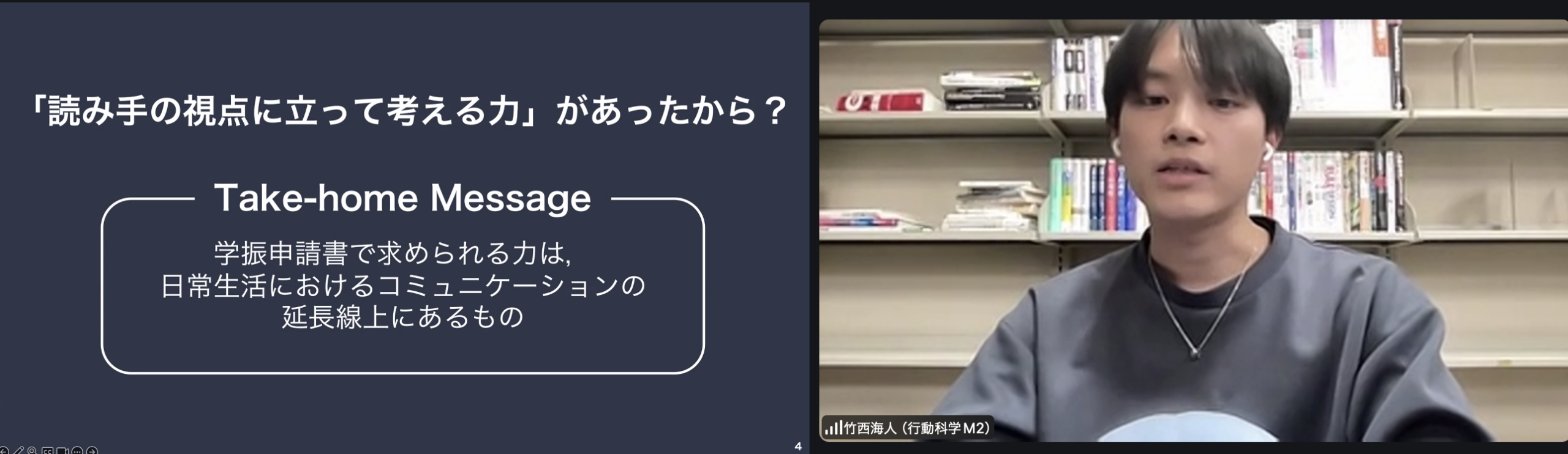 最後は、現在修士課程2年生で来年度のDC1に採用内定した竹西 海人さん(行動科学研究室)に『生活の一コマから眺める学振申請書の書き方』と題して話題提供いただきました。荒井さんや駒田さんの話題提供でも強調された「読み手に理解してもらう工夫」、「読み手の視点に立つ力」について、申請書の作成は日常生活のコミュニケーションの延長線上と言えるのではないか、という角度から申請書の書き方について解説。誰しもが共感できそうな「生活の一コマ」という例を題材に、とても分かりやすく、そしてたいへん楽しく、申請書を書く上で気を付けるポイントについて学べる内容でした。例えば、研究の内容を書く際は「相手が何を知っているのか」を前提知識として考慮したうえで、「何を知りたいか」を書くことが大切なポイント、ということです。その他、申請書の形式に従って書くこと、研究の意義についてはメタ視点で捉え制約の中で書くこと、など「書く作業」そのものよりも準備に多くの時間を割いたという体験談が共有されました。今回初めて学振に申請する、ゼロから申請書を書く人にとっては大まかにどういった項目をどういう観点で書くのか、今回再チャレンジする人にとっては不採択だった申請書を改良するアイデアを見つけられる機会になるお話しでした。