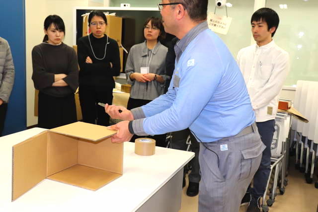そして、最後にダンボール箱のかけ紐の締め方の実習と、立体作品に合わせたダンボール箱の作り方の実演があり、ワークショップは終了しました。